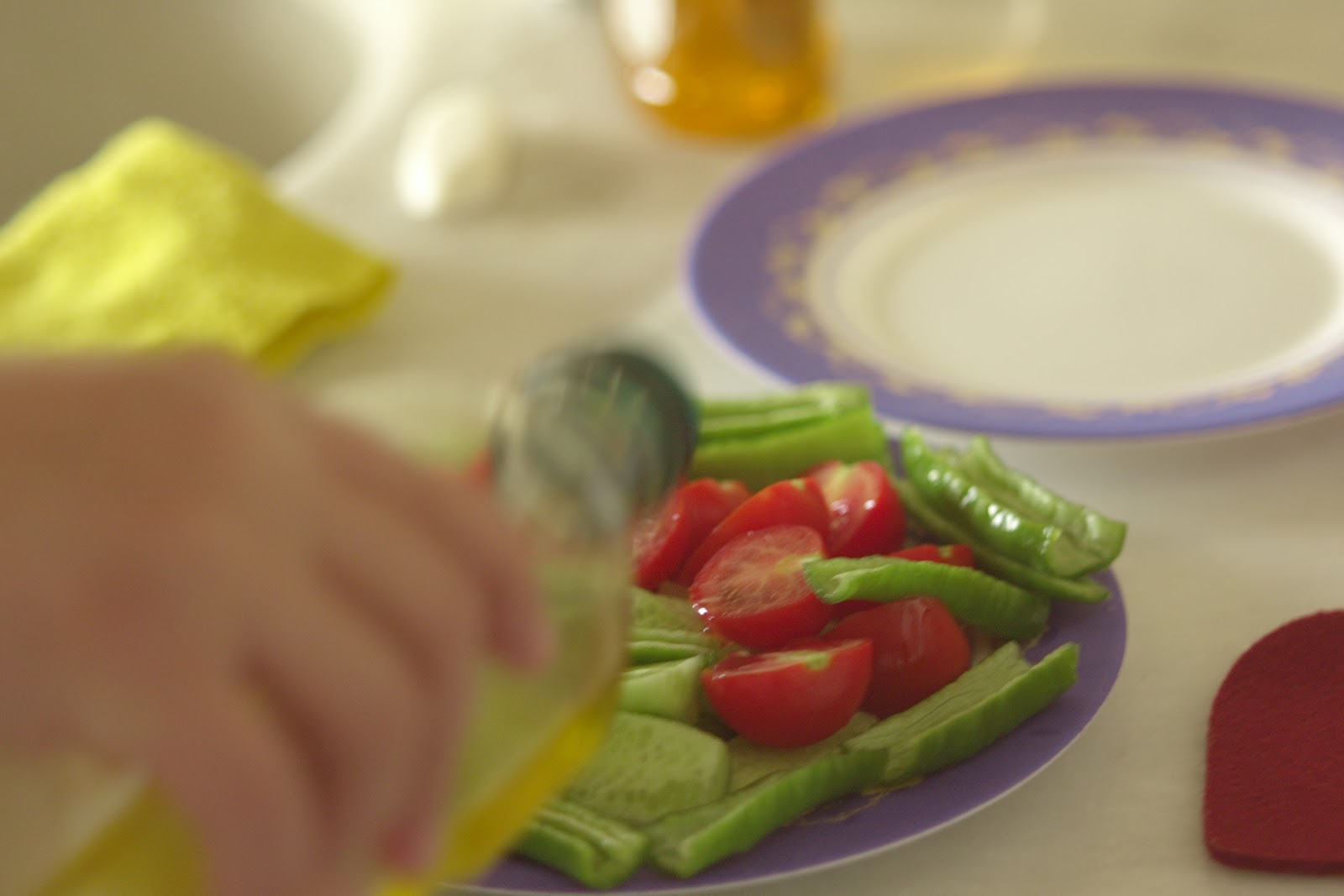 This is today's breakfast. It was vegetables in olive oil, white cheese, sucuk (sausage) in eggs, green and black olives, orange juice and bread. It is typical of a weekend breakafast I am told in a normal household.